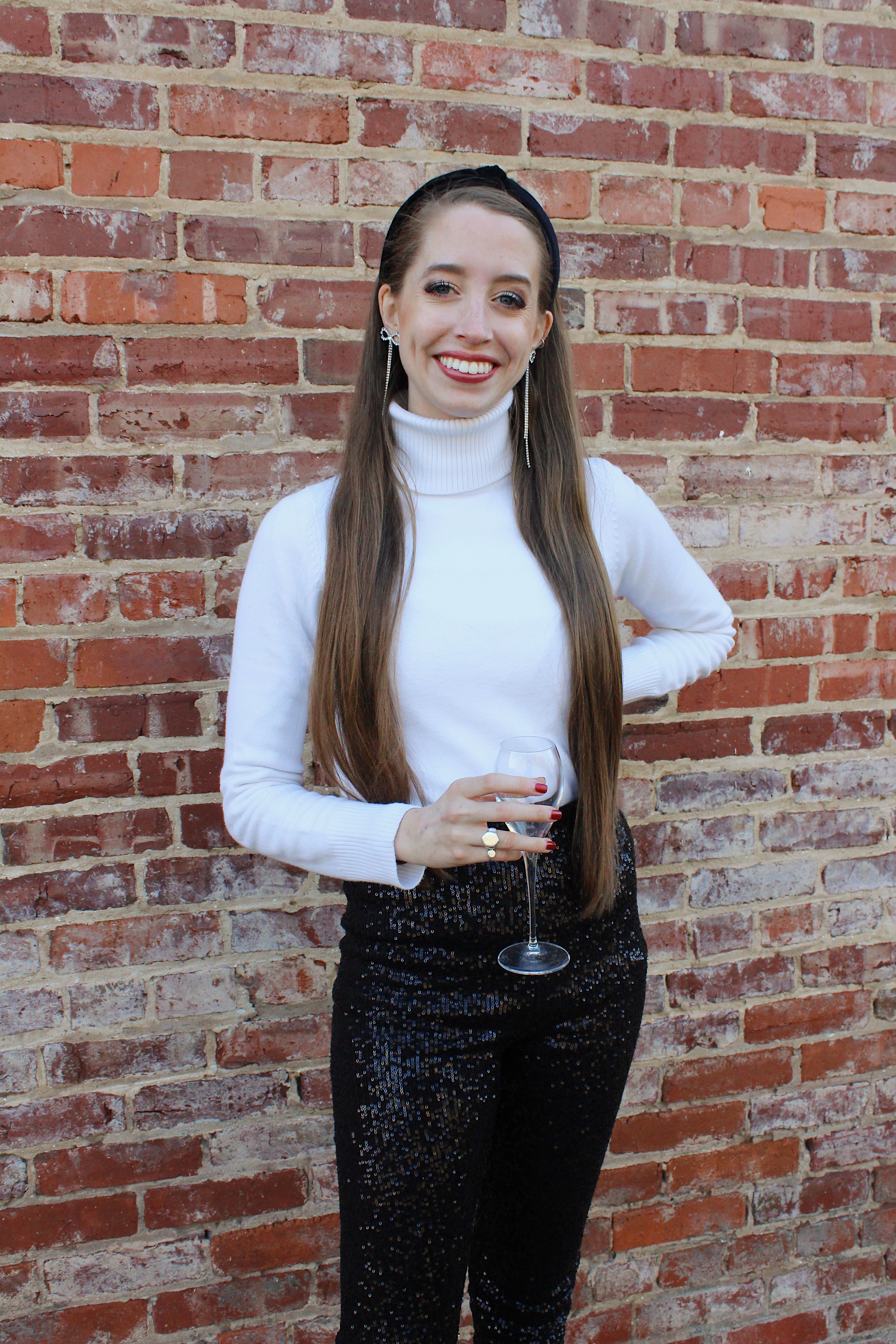 | Sequin pants (2, 3) | Sweater Headband | Earrings | Heels |